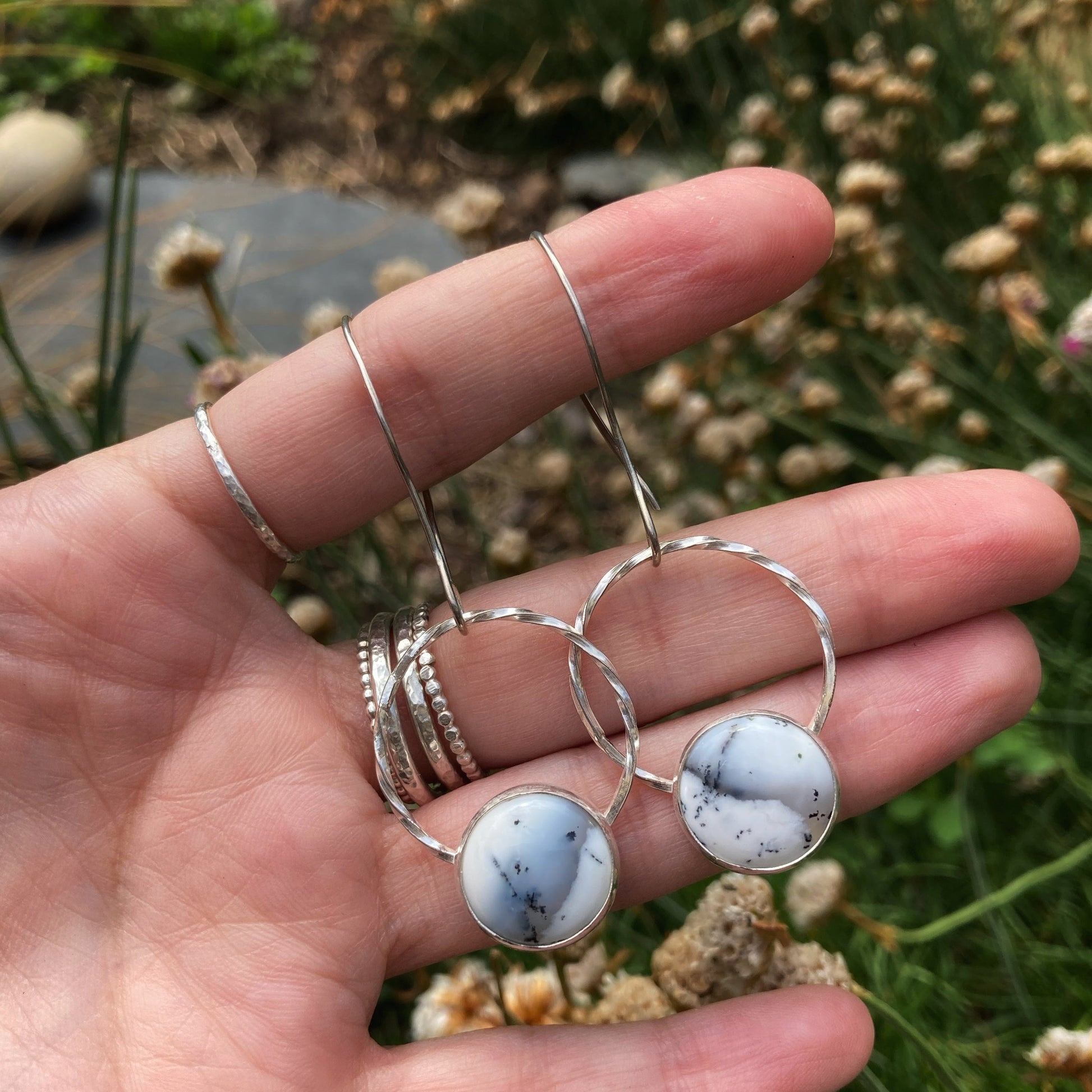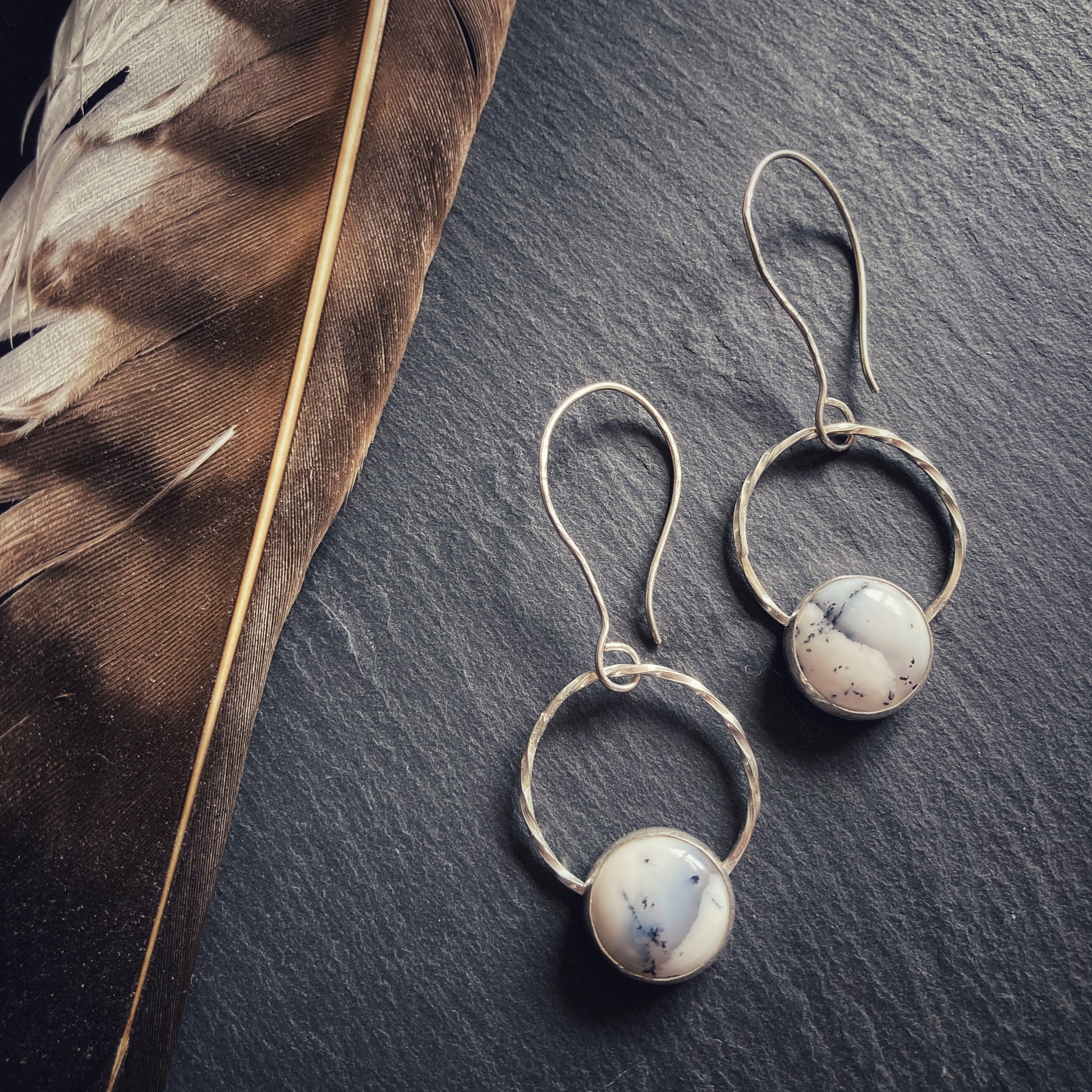 I have bezel set two gorgeous, round Dendritic Agate cabochons in recycled sterling silver. They are soldered to twisted recycled silver wire circles and hang from long, handmade ear wires.