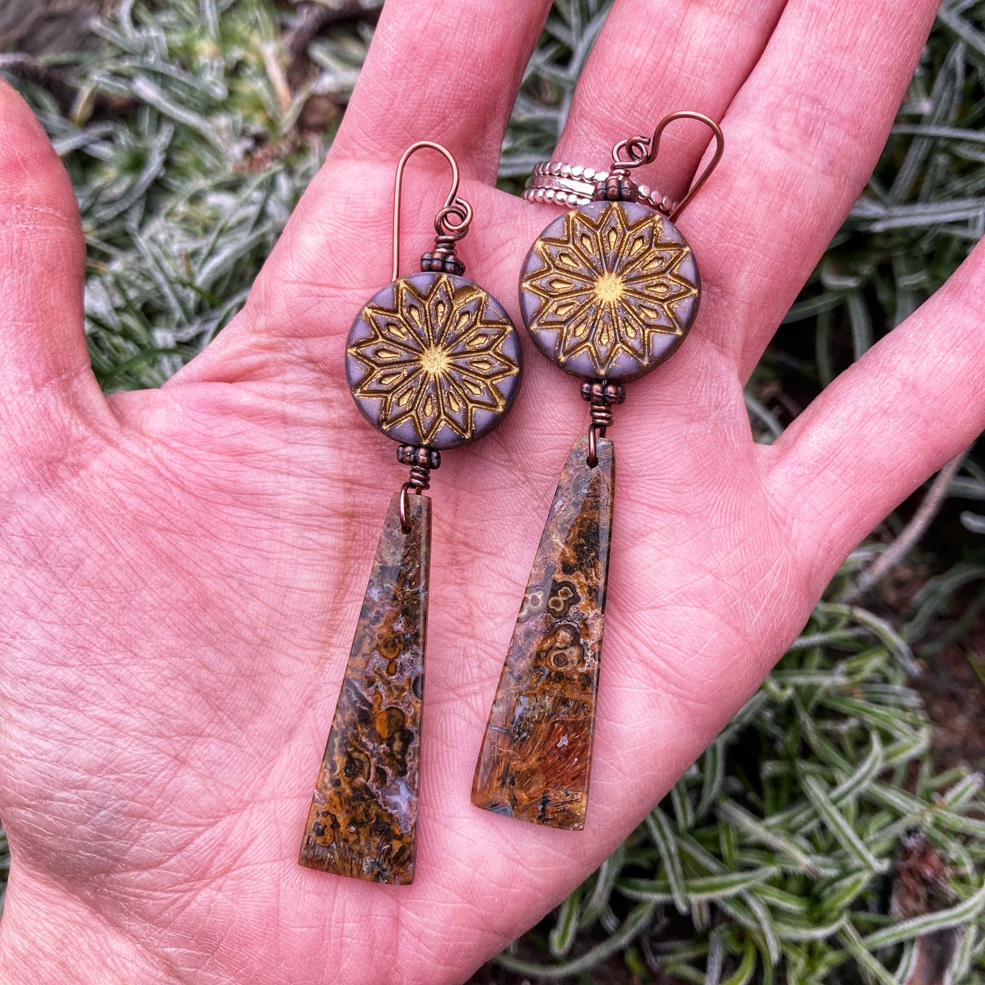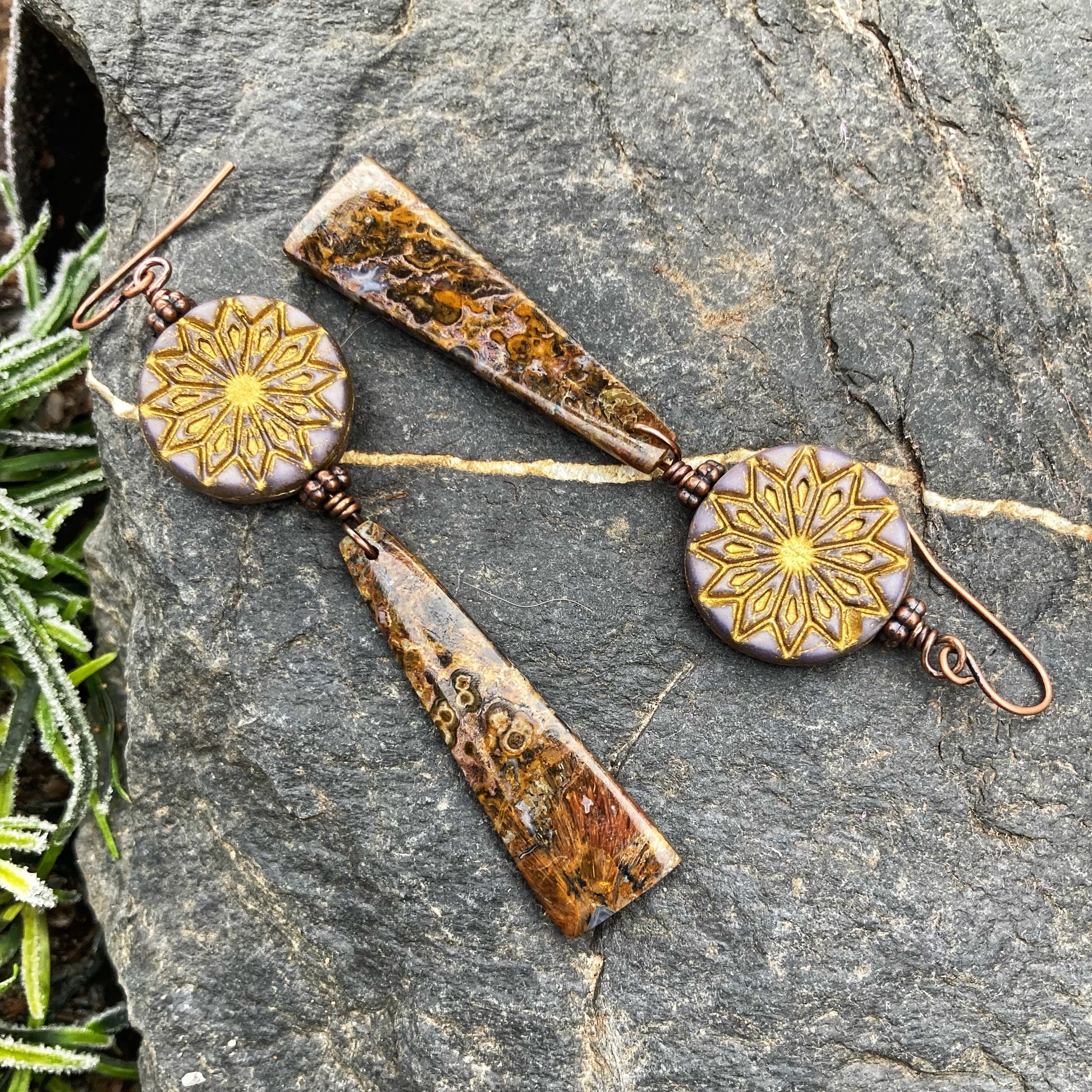 These unique gemstone earrings, feature long natural Ocean Jasper drops in earthy tones. I have teamed the with Czech glass flower beads and they hang from antiqued copper ear wires.