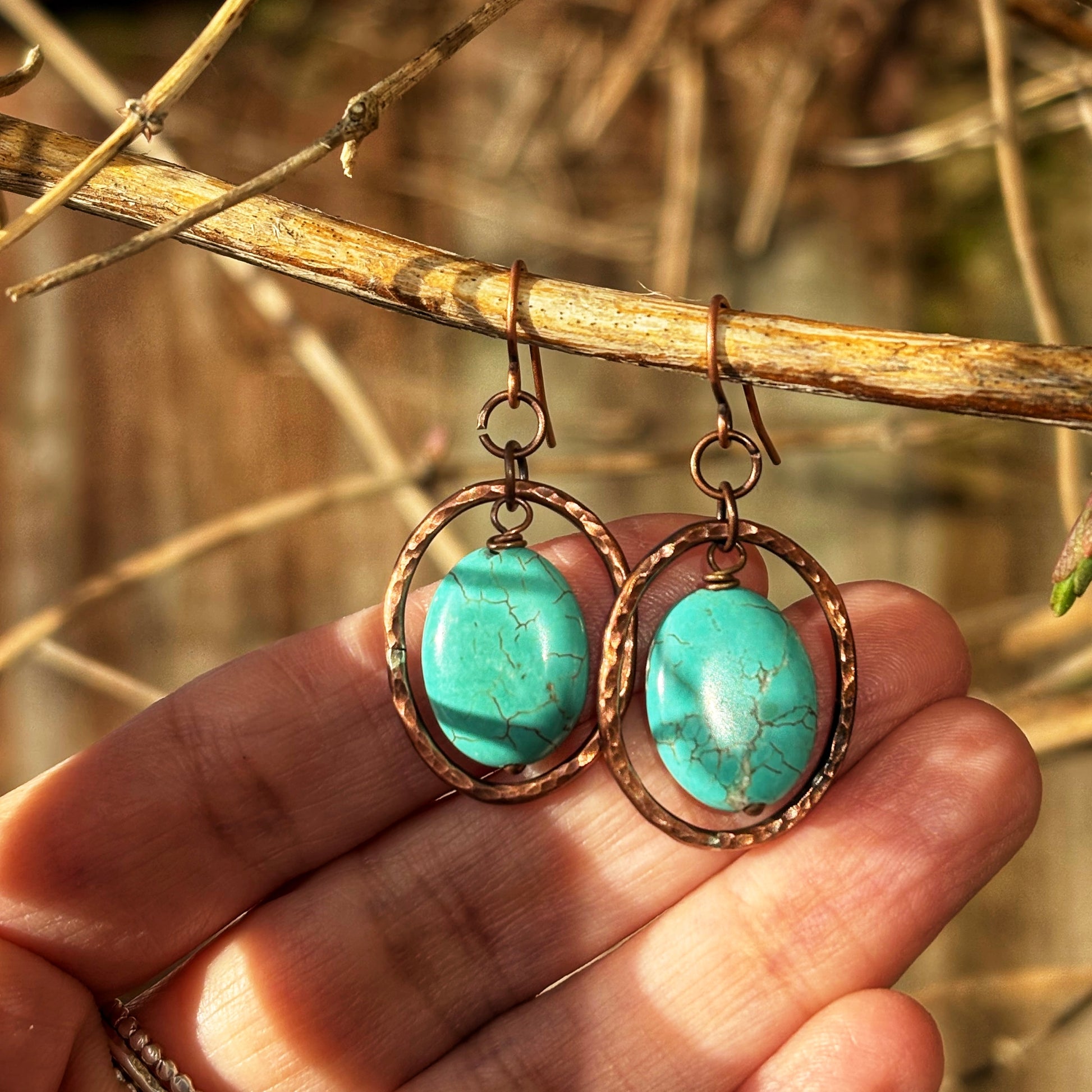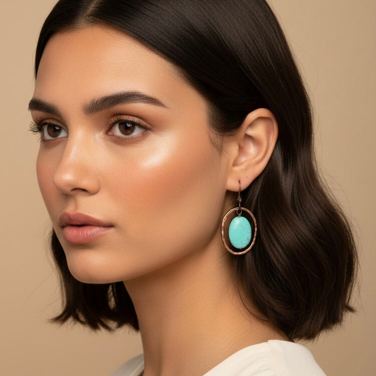 Our Copper Sky earrings are handcrafted copper drop earrings featuring bright, dyed turquoise oval beads, inspired by open desert skies and earthy bohemian style. Lightweight and comfortable, these turquoise and copper earrings add a warm, Southwest-inspired touch to everyday outfits and free-spirited looks alike.