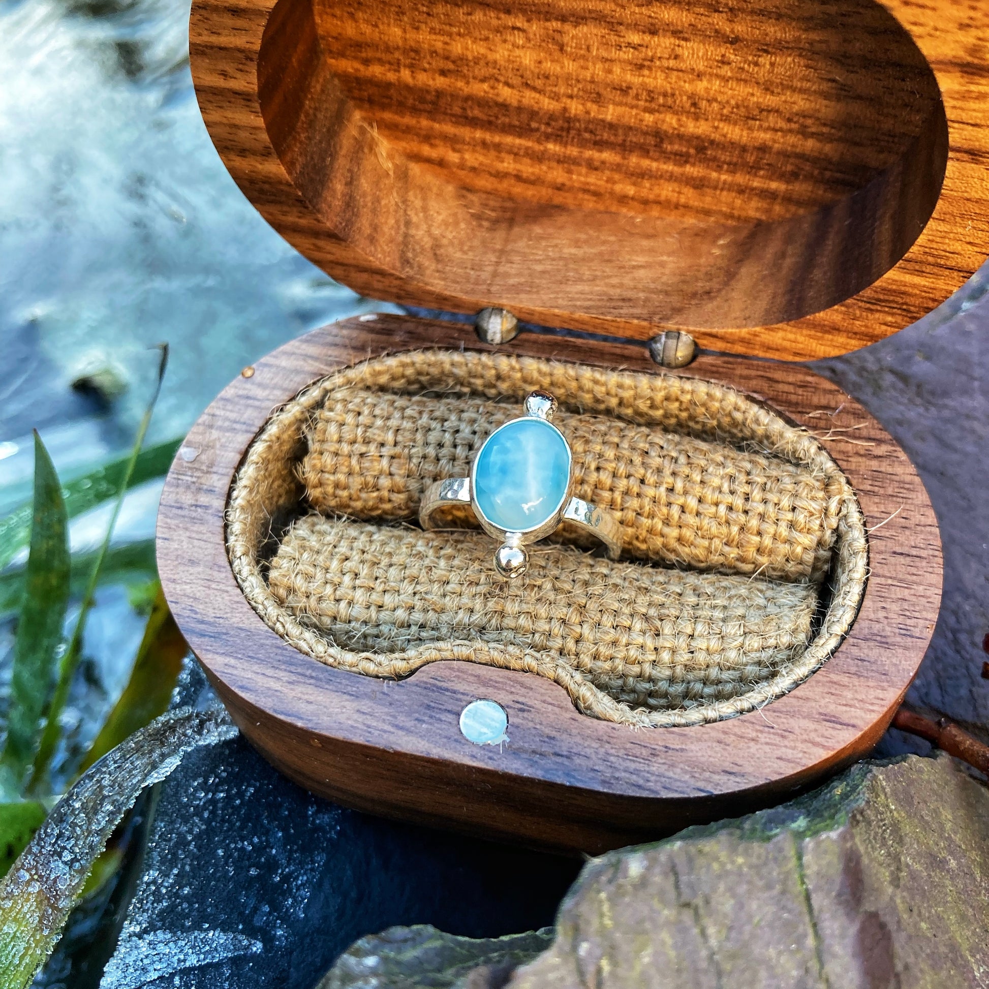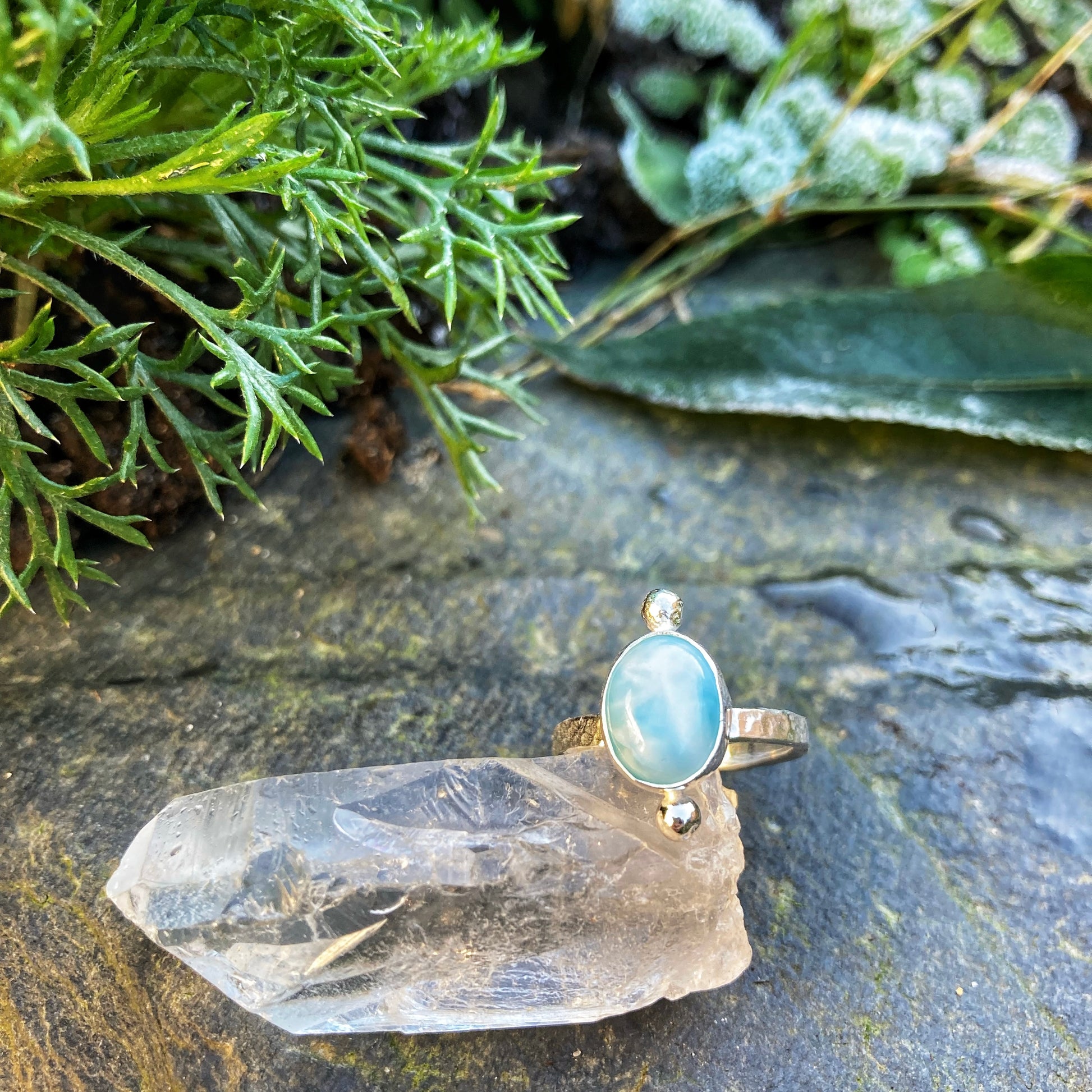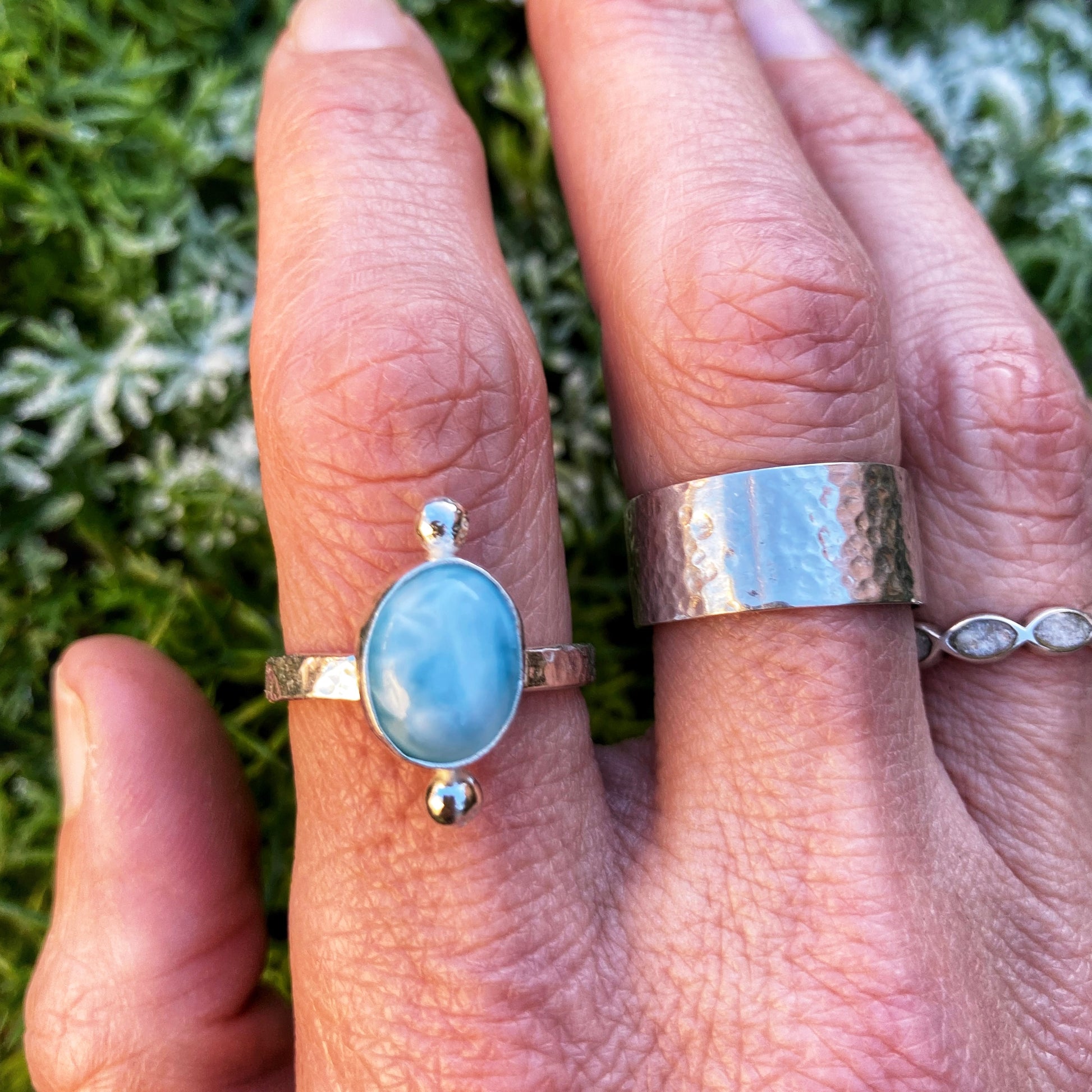 I have set this beautiful, natural Larimar cabochon in recycled sterling silver before adding silver balls to the top and bottom. She sits upon a 2mm hammered band which sparkles and catches the light beautifully. This ring is a UK/AUS size M.