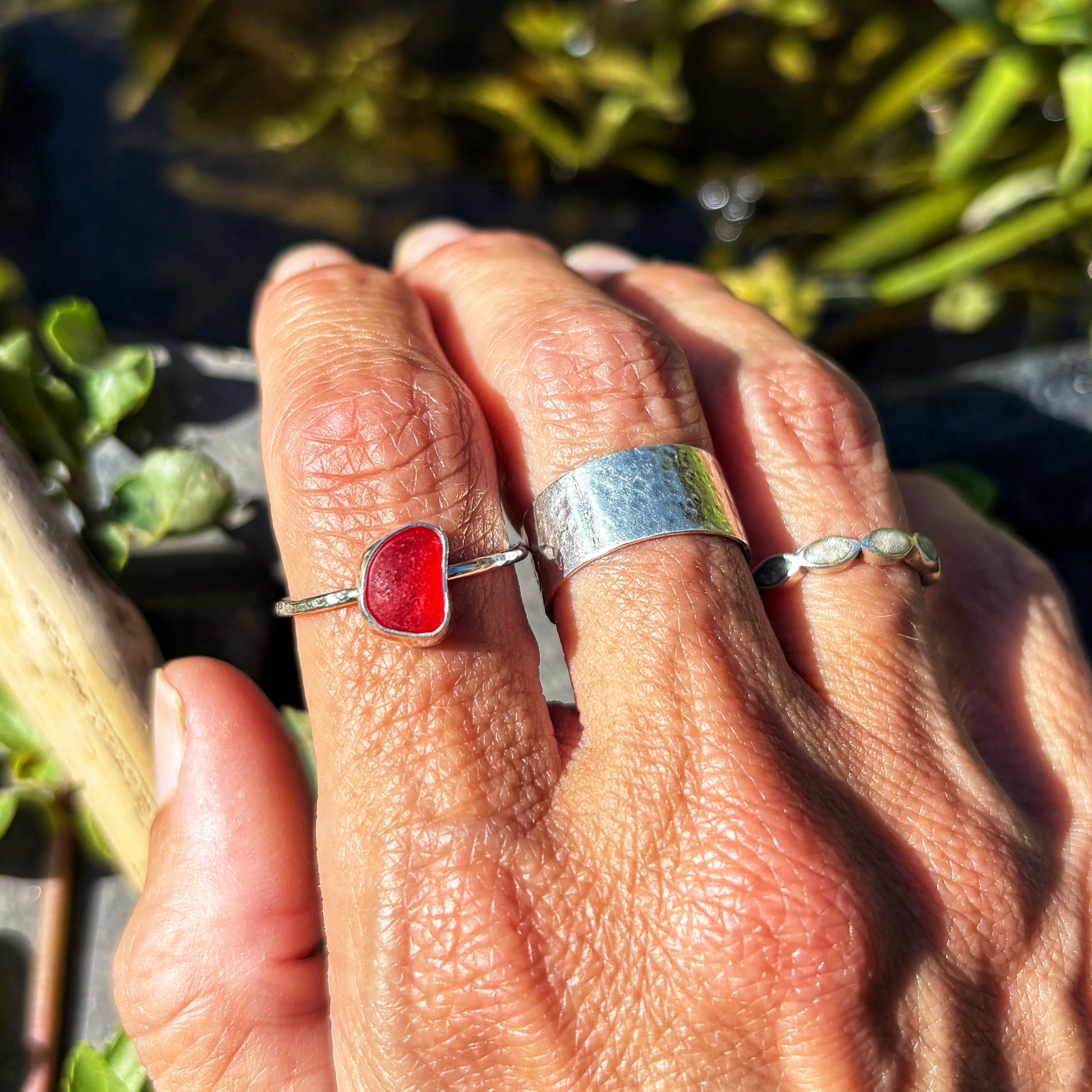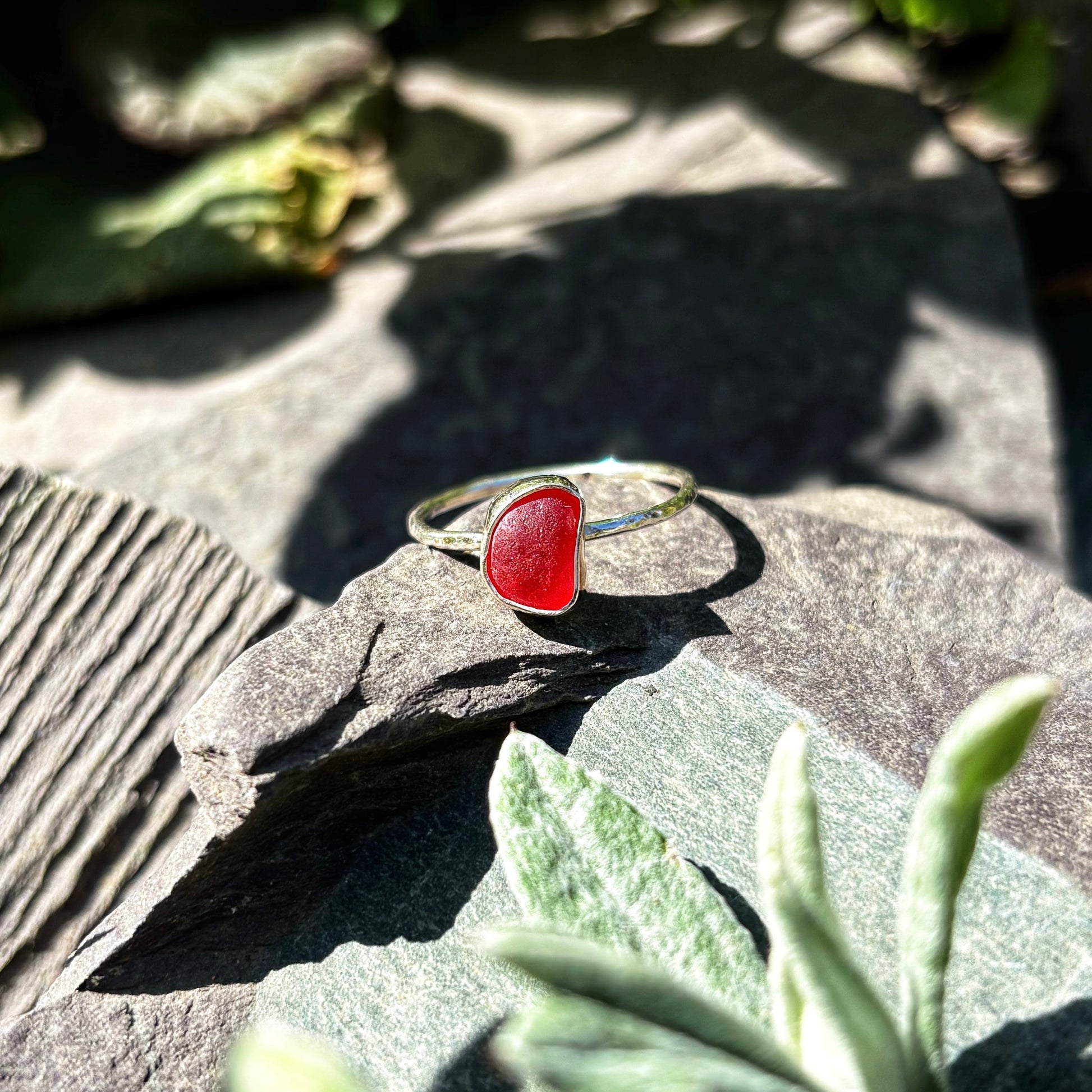 I have set this beautiful, natural, dinky red green piece of sea glass in recycled sterling silver. She sits upon a skinny 1.2mm hammered band which sparkles and catches the light beautifully. This ring is a UK/AUS size P. The sea glass in its setting is approximately 4mm.