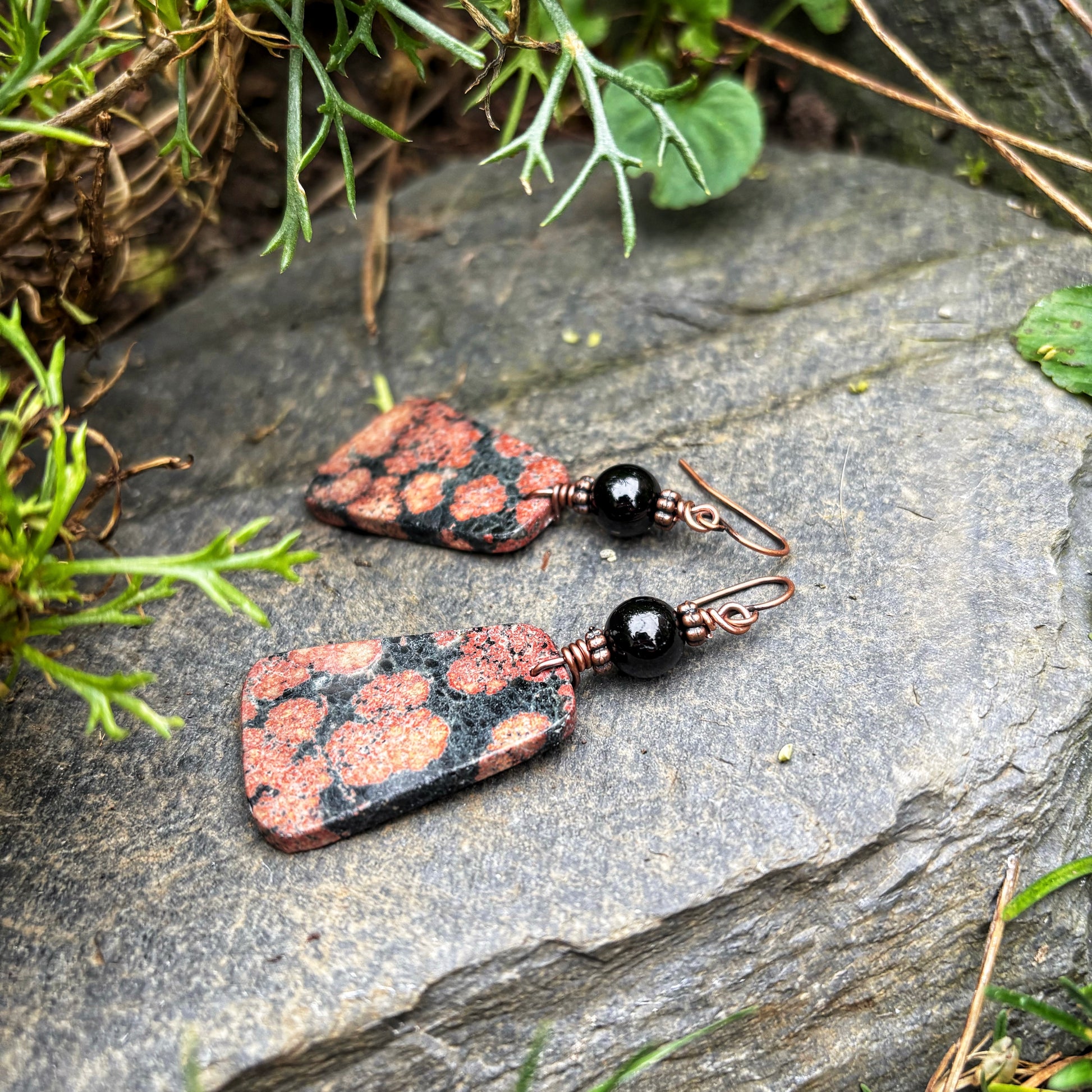 These one of a kind earrings feature beautiful, Firework Obsidian, teamed with copper and black Tourmaline. They hang from antiqued copper ear wires.