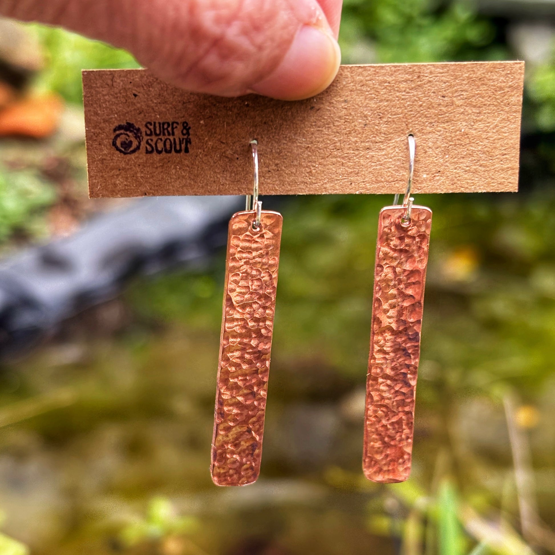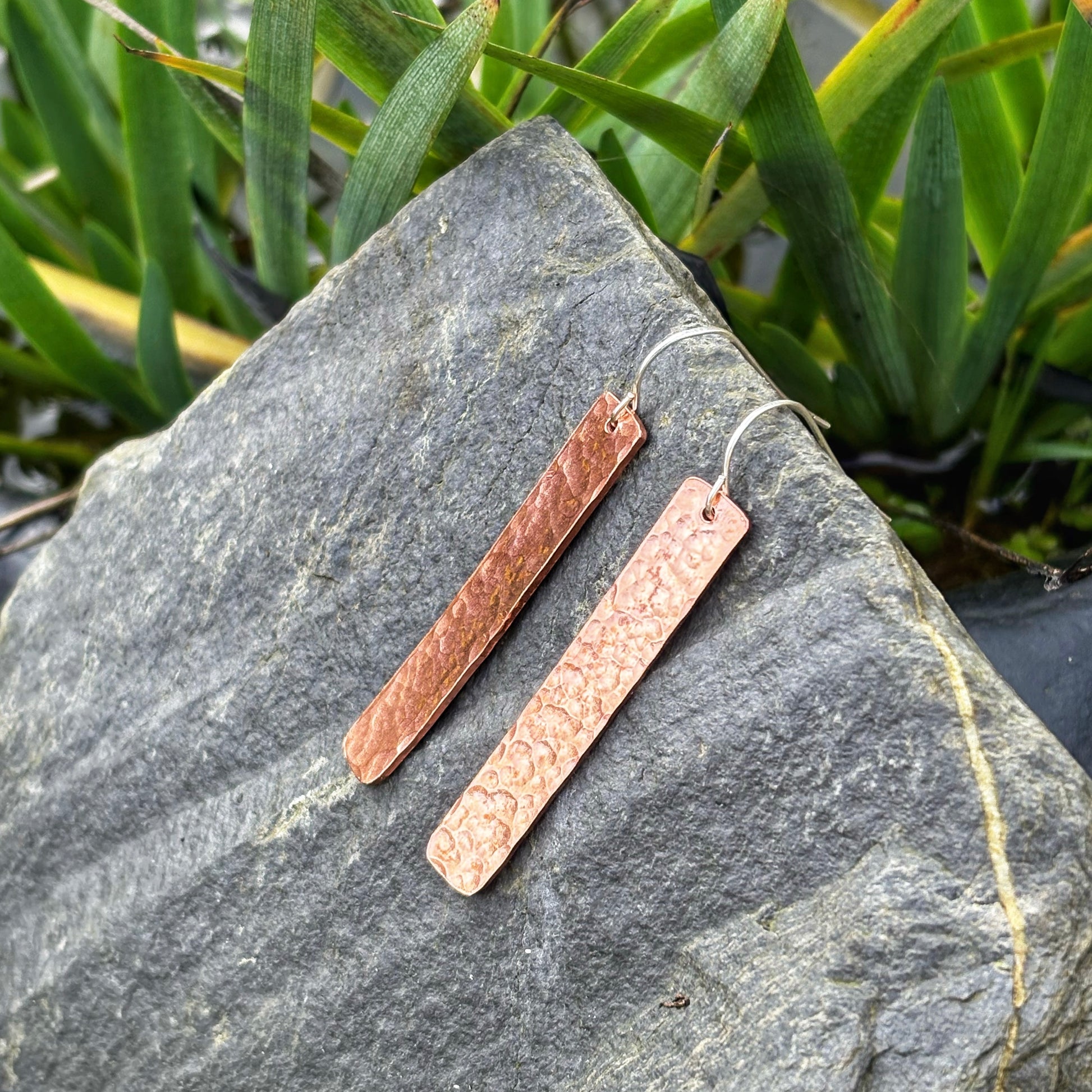 Capture the peaceful beauty of moving water with these Flowing Creek Copper Earrings. Each pair features hand hammered copper bars with an organic, rippling texture that reflects the look of a gently flowing stream. They are polished to a bright shine and hang from high quality 925 sterling silver ear wires, these lightweight dangle earrings offer effortless boho style with a warm, earthy glow.