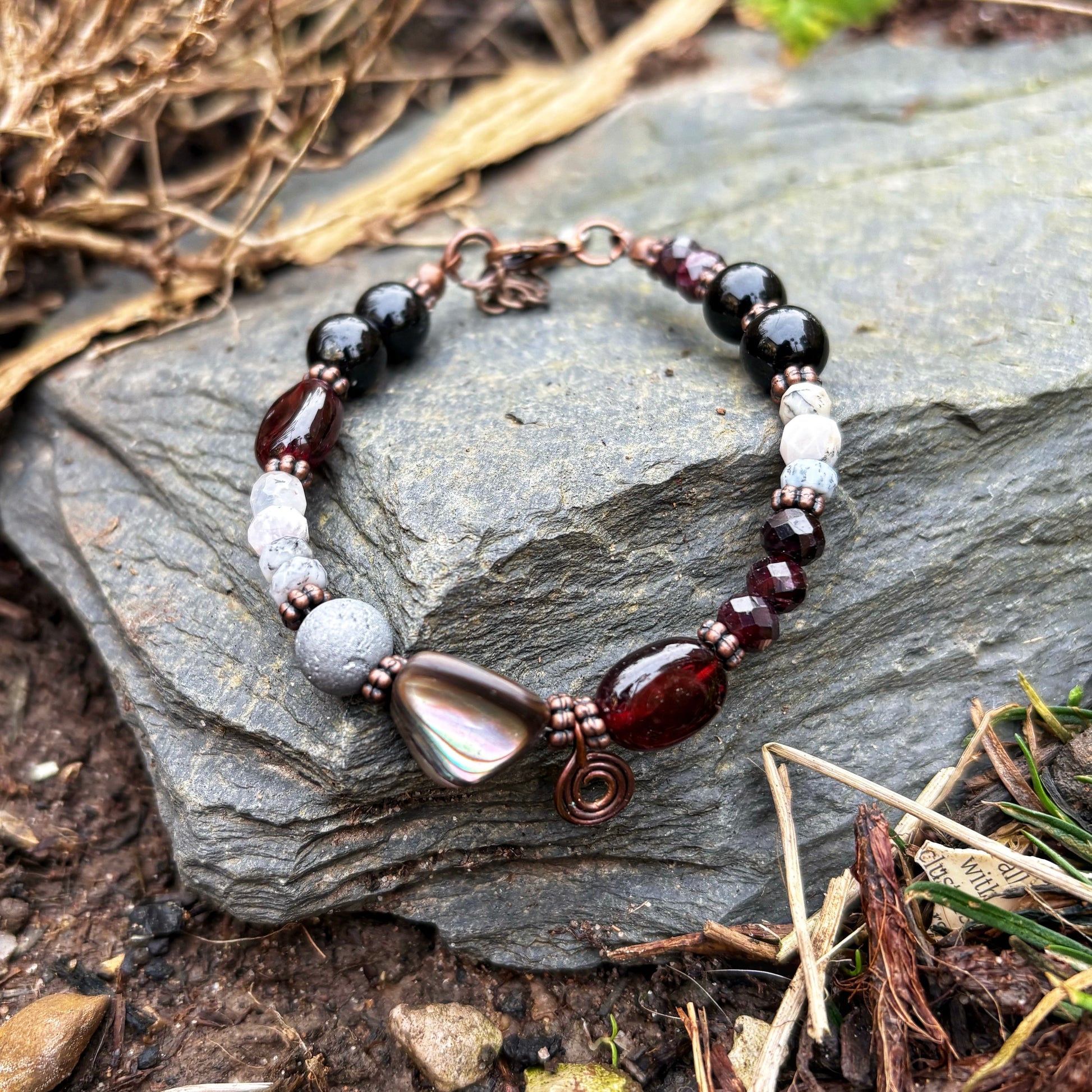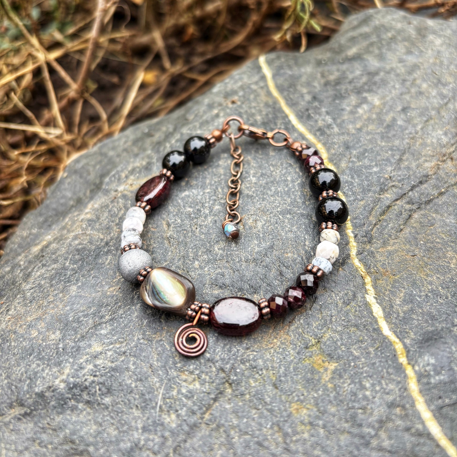 This one of a kind bracelet features a mixture of natural gemstones including Garnet, Abalone, Dendritic Agate, Black Tourmaline and Druzy Agate. I've also added a copper spiral swirl.