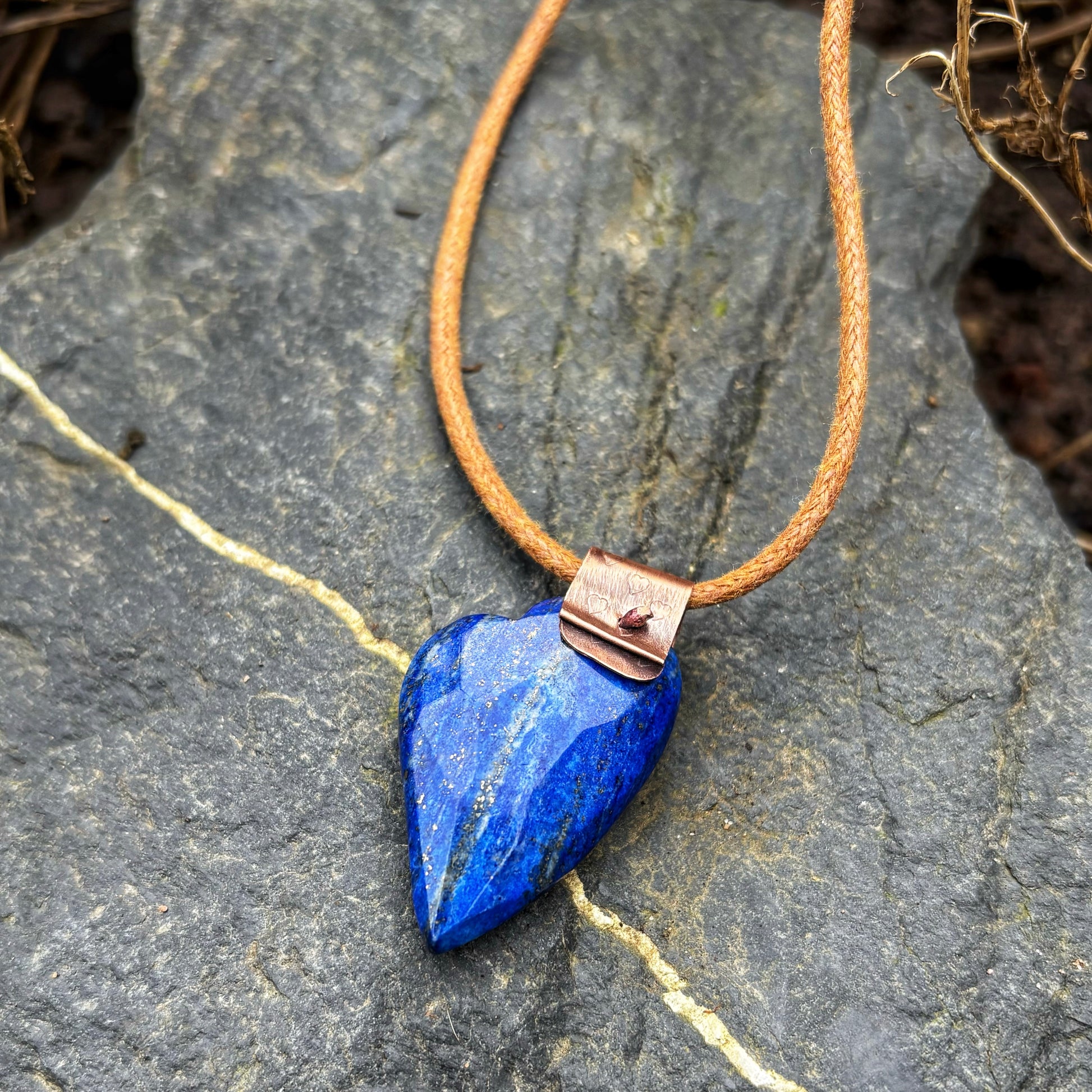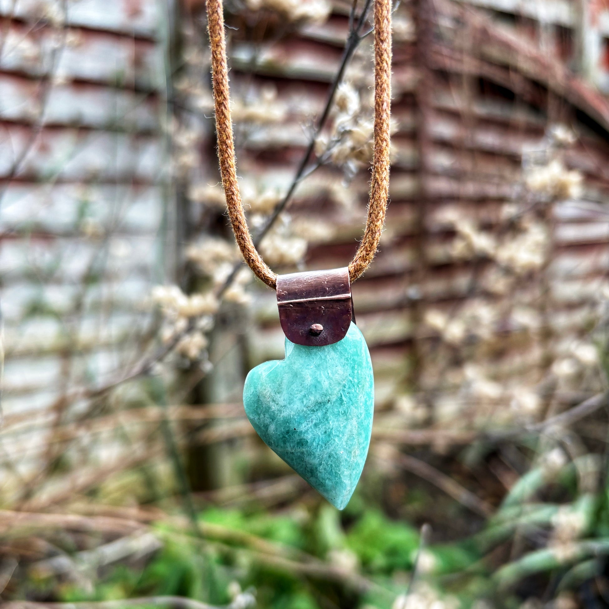 These one of a kind pendant necklaces feature natural gemstone hearts teamed with handmade copper bails and cord. You can choose from Amazonite, Aquamarine, Labradorite and Lapis Lazuli. Each is one of a kind.