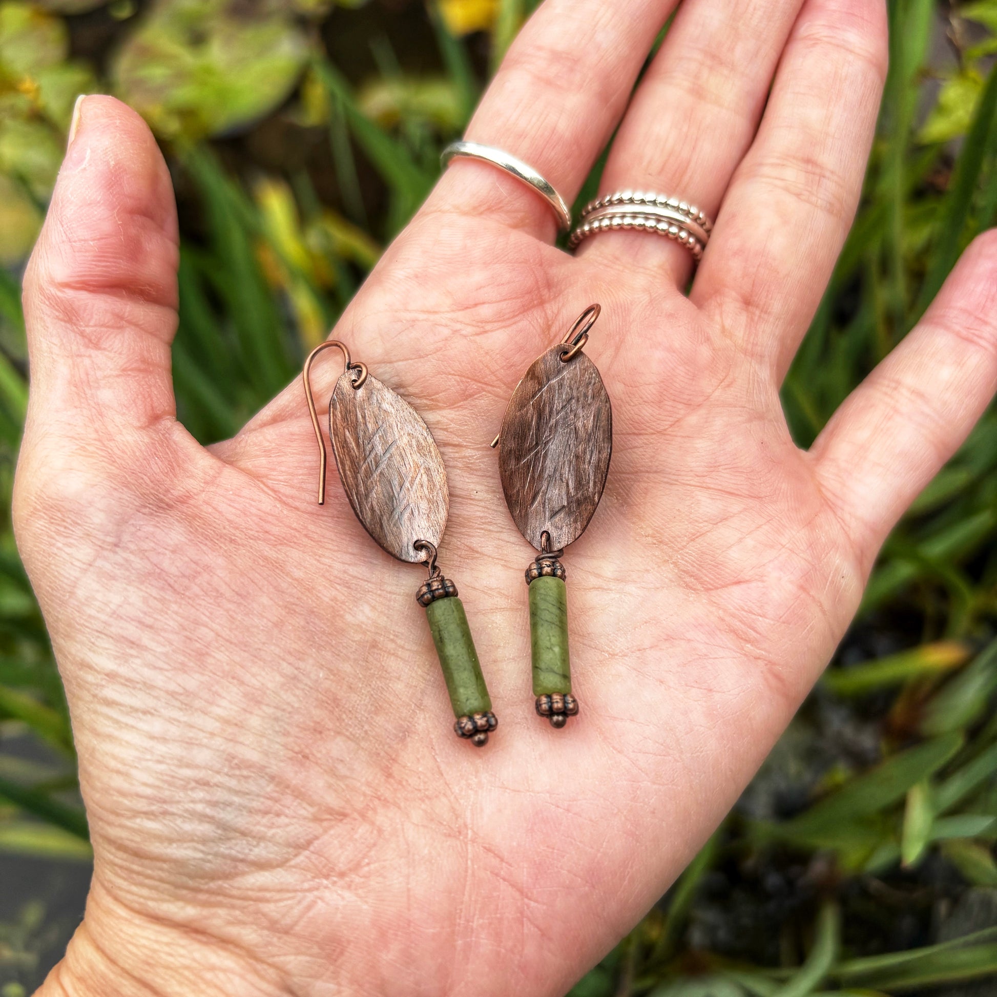 These pretty green earrings feature copper sheet squares, which I have textured and oxidised to give them a pretty, weathered feel. I have teamed them with Green Jade tube beads. They hang from antiqued copper ear wires.