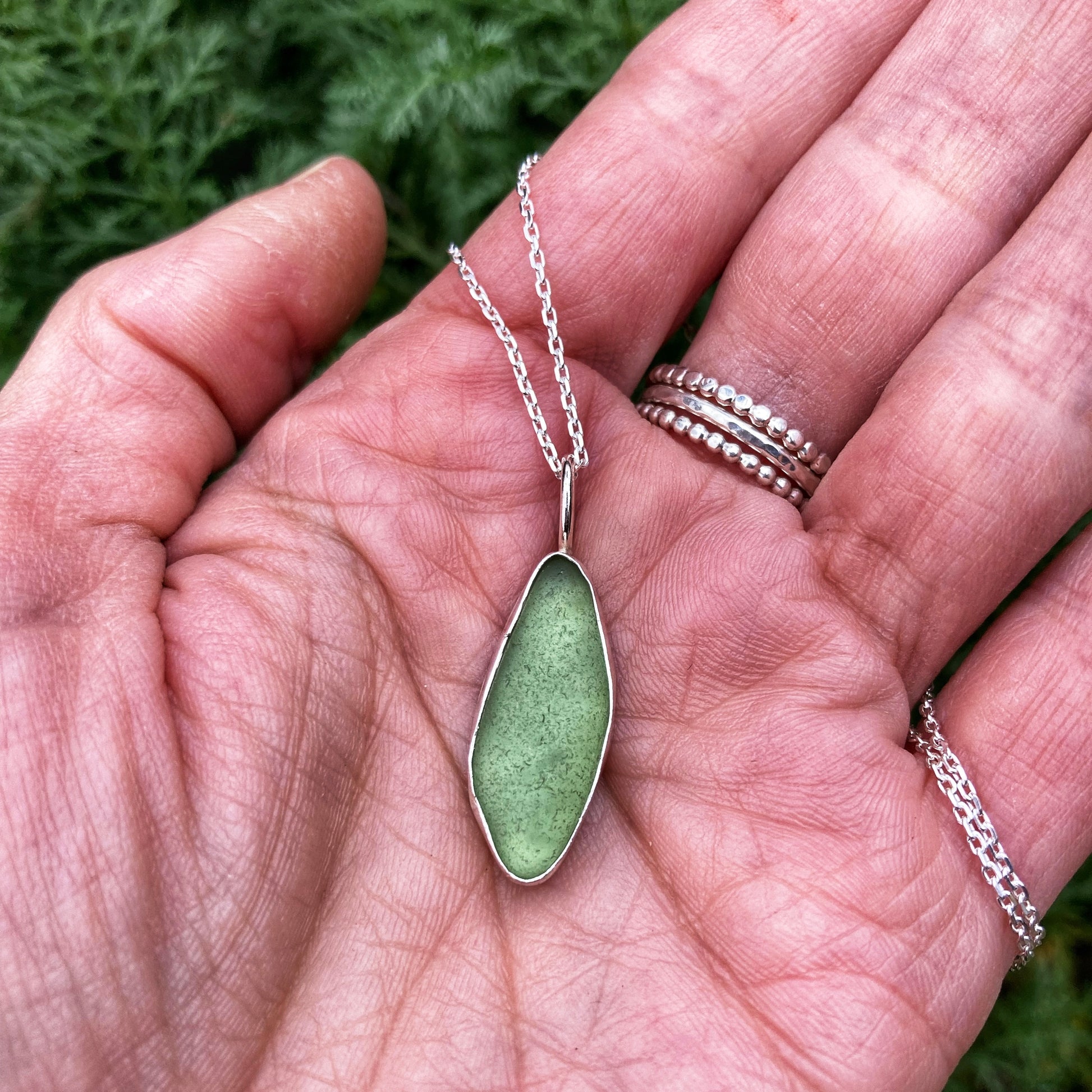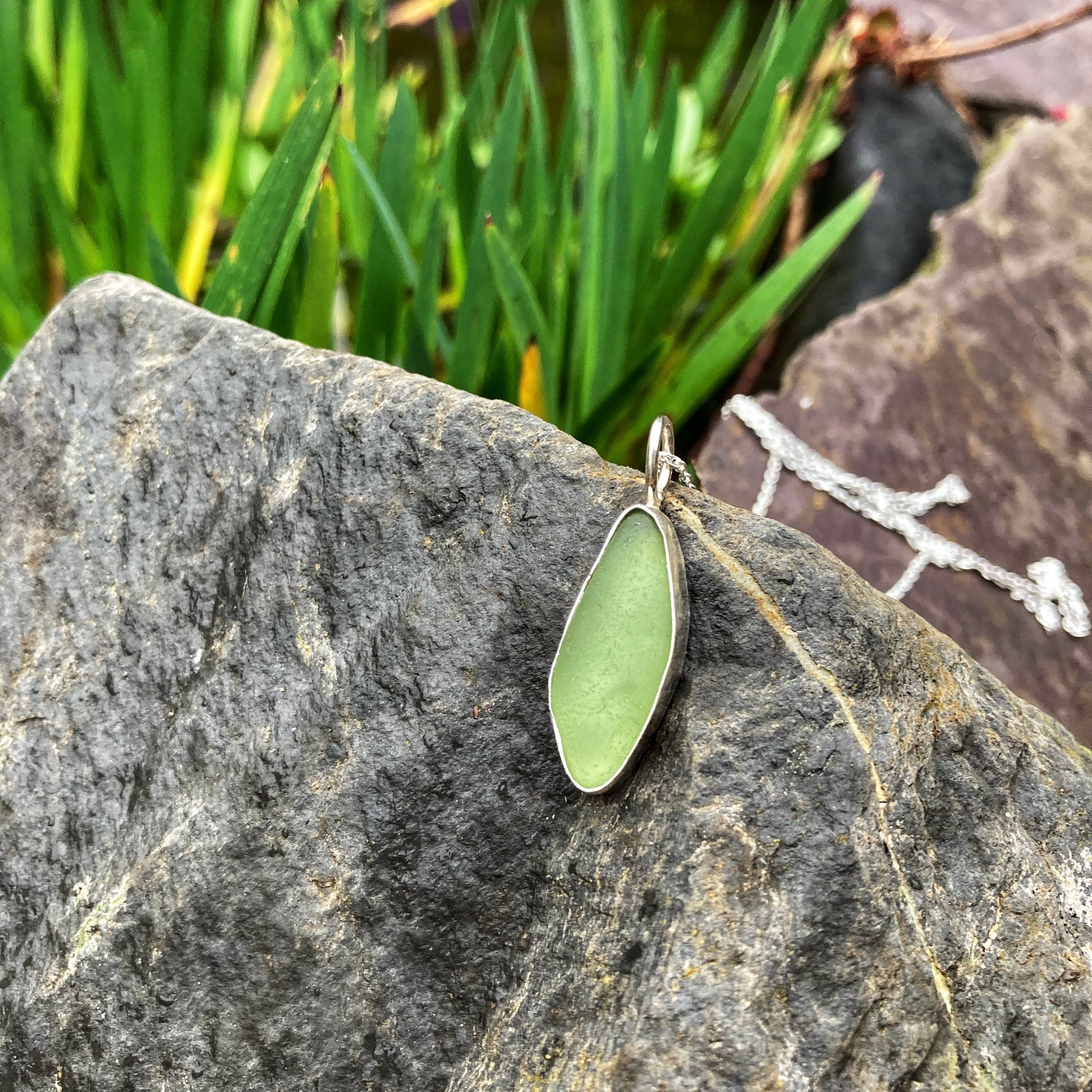 I have bezel set this pretty piece of green sea glass in recycled sterling silver. All of the sea glass used in my designs is 100% natural and collected from the North Devon coast. It is tumbled and polished only by the sea - and carries the natural quirks you would expect after years of being tossed around by waves and rocks :-)