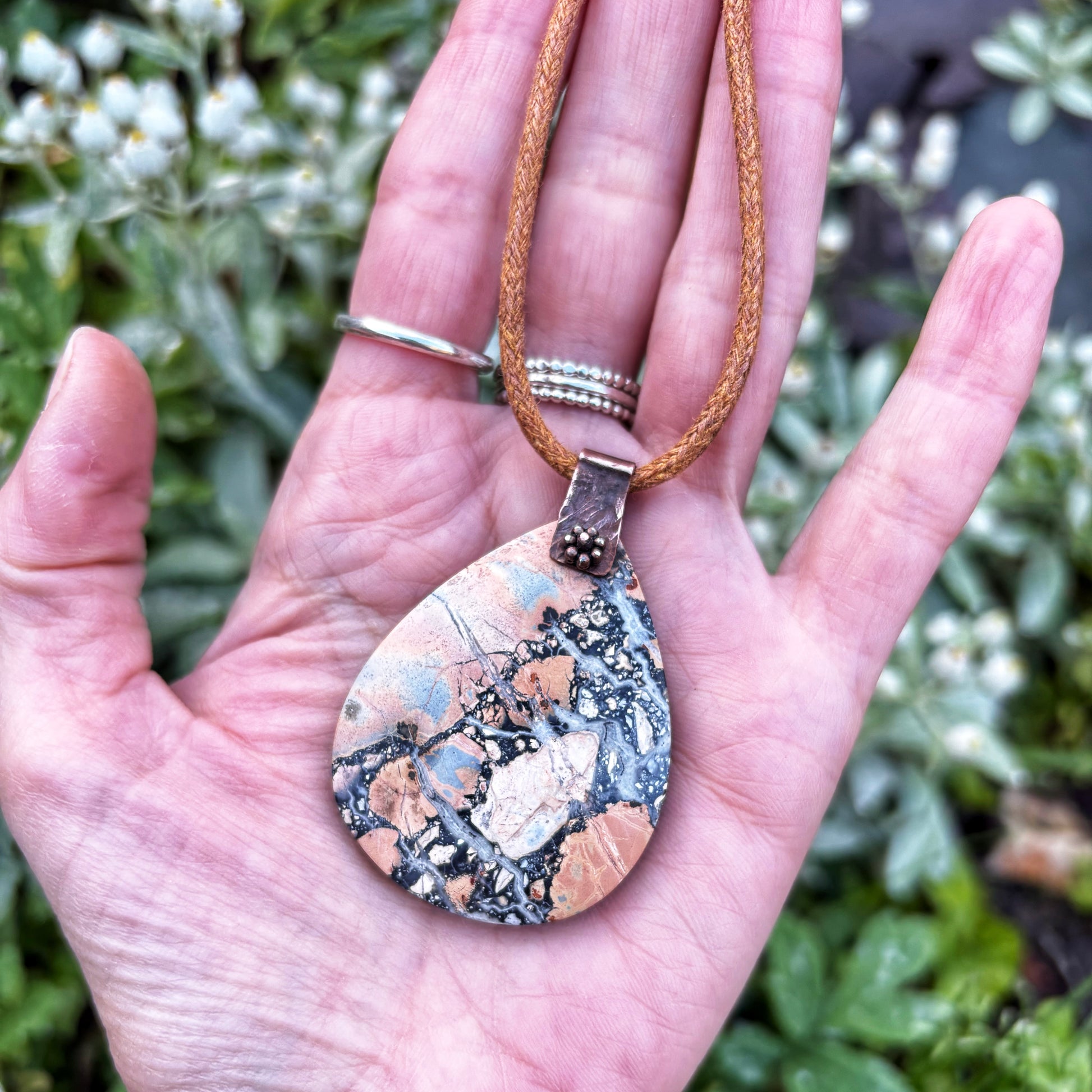 This one of a kind necklace features a beautiful, natural piece of pear shaped Maligano Jasper. I have drilled it before creating a copper bail, which I have textured and antiqued to give it a boho, rustic look before adding a tiny flower.