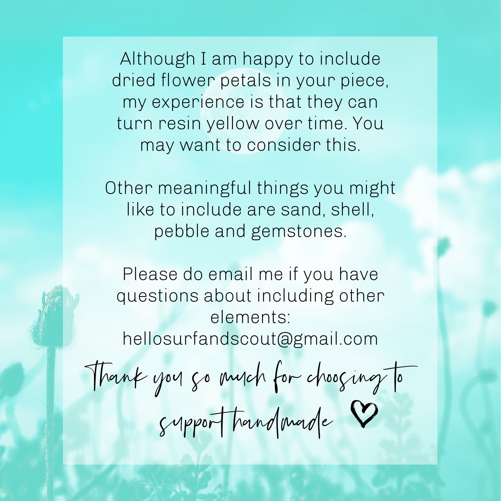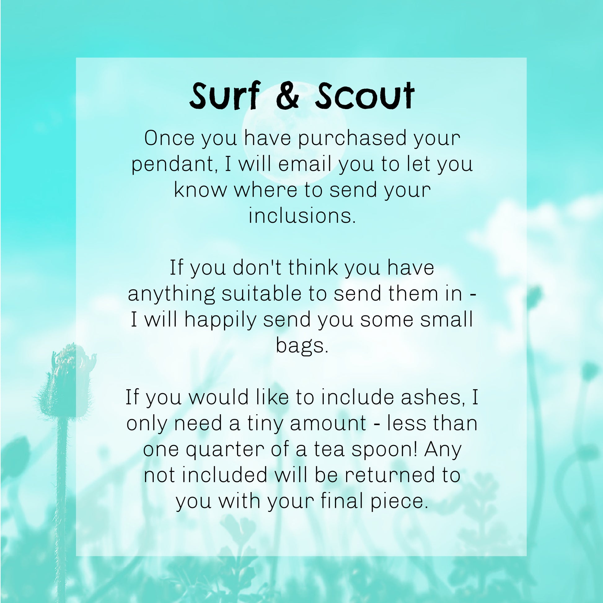 This item is custom made for you, using your own inclusions within an oval, recycled sterling silver pendant handmade by me on a 16 inch sterling silver chain. To create the memorial piece pictured, I have set sand from Scout's favorite beach, a crushed shell and ashes within resin.