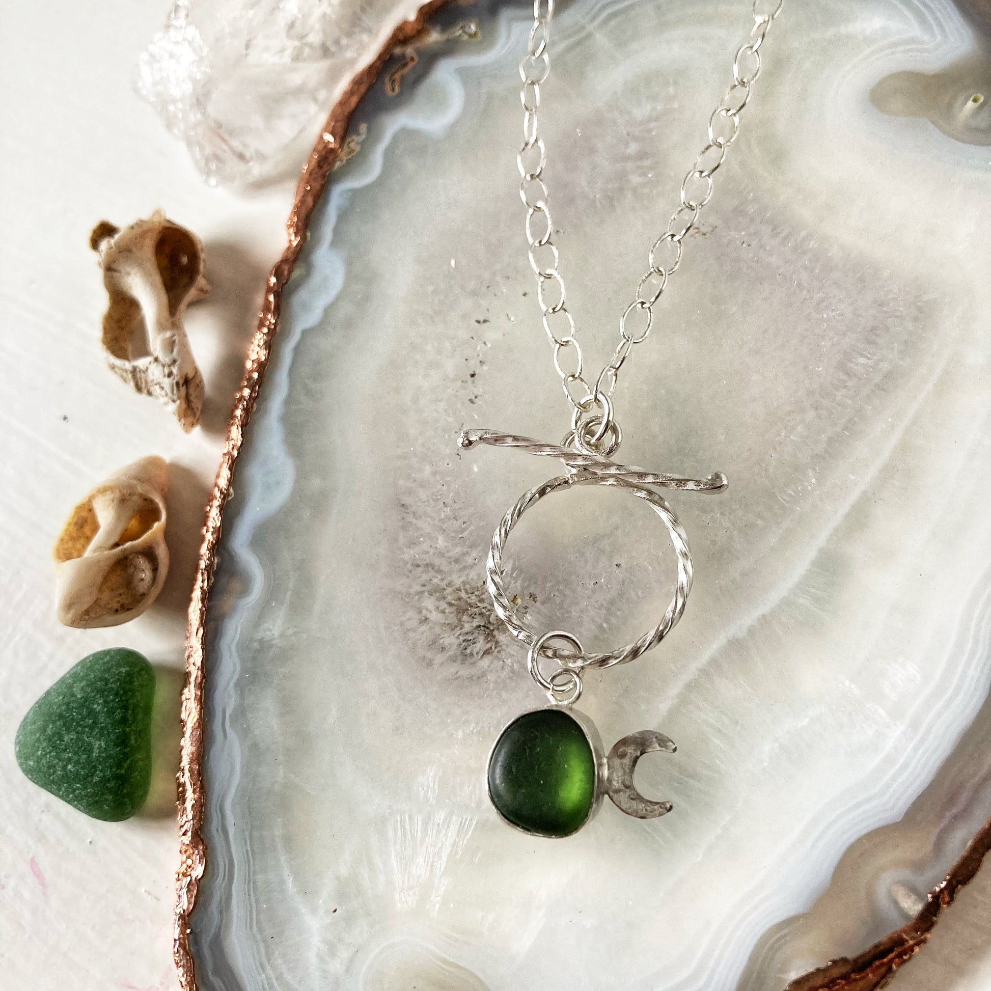 I have set this lovely forest green piece of sea glass in silver and added a hammered crescent moon. It hangs from a handmade, decorative toggle, pretty oval link sterling silver chain and closes with a 925 stamped trigger clasp. It measures 16 inches.