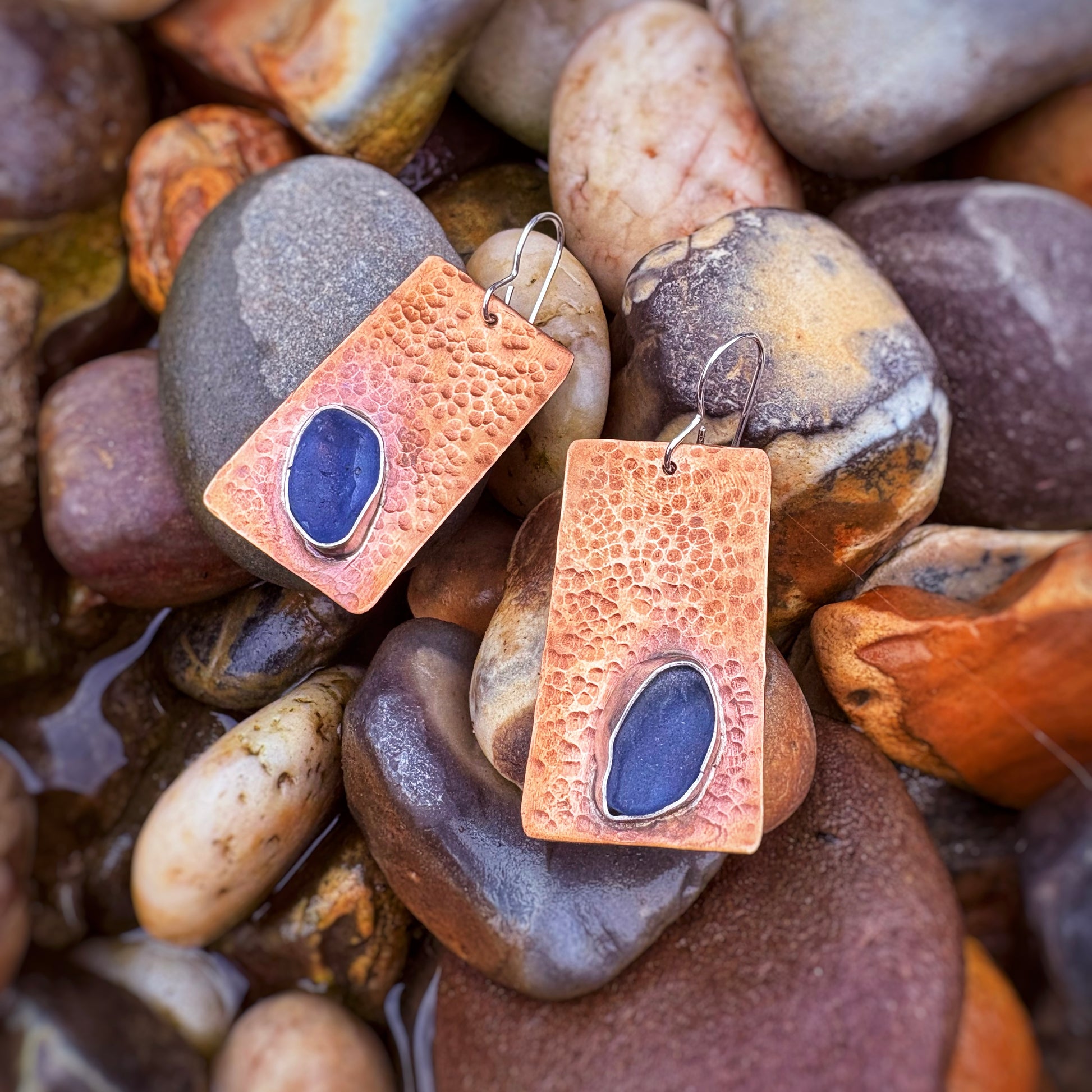 These unique autumnal earrings feature bezel set cobalt blue sea glass on hand cut, hammered and oxidised (antiqued) copper. They hang from 925, sterling silver ear wires.