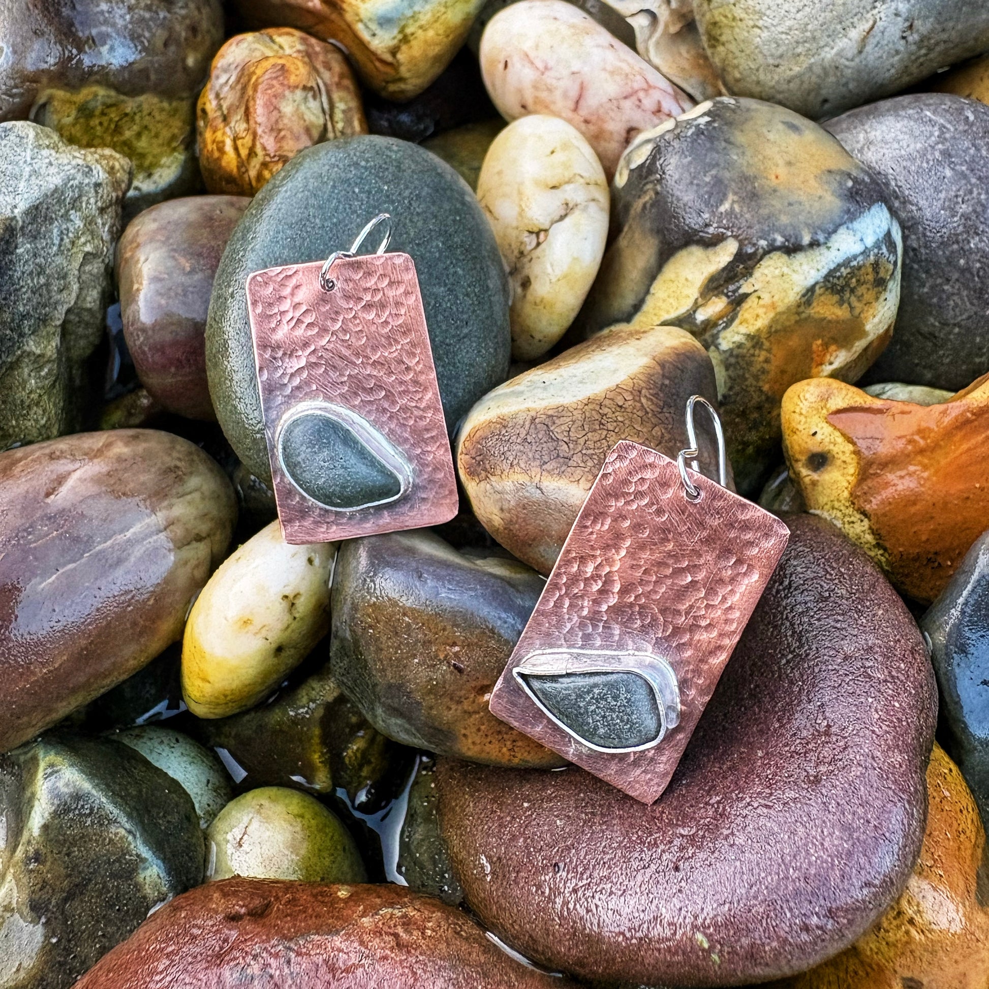 These unique autumnal earrings feature bezel set deep green shade of sea glass on hand cut, hammered and oxidised (antiqued) copper. I have also torch fired the copper multiple times to help create the different, weathered colouring, prior to oxidising. They hang from 925, sterling silver ear wires.