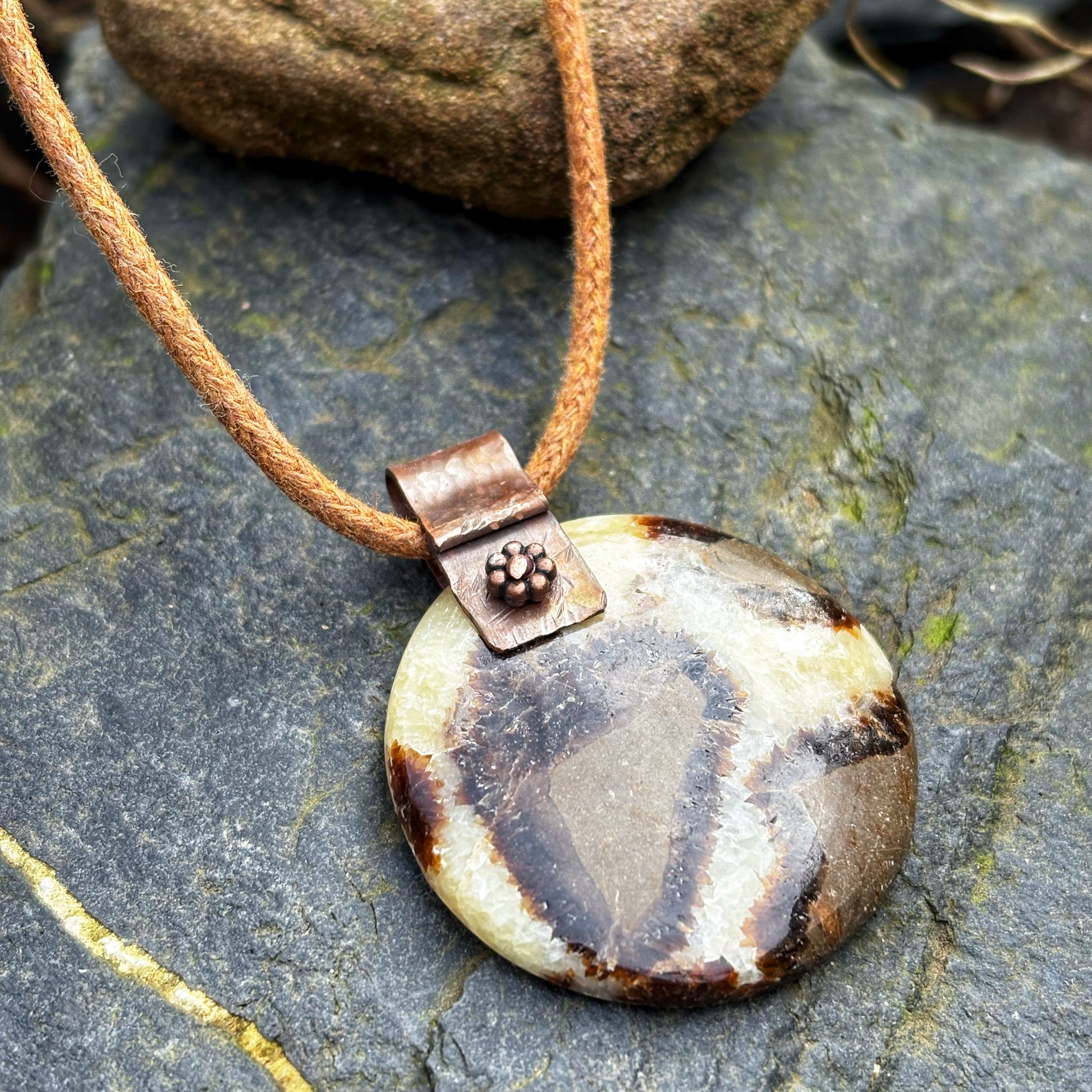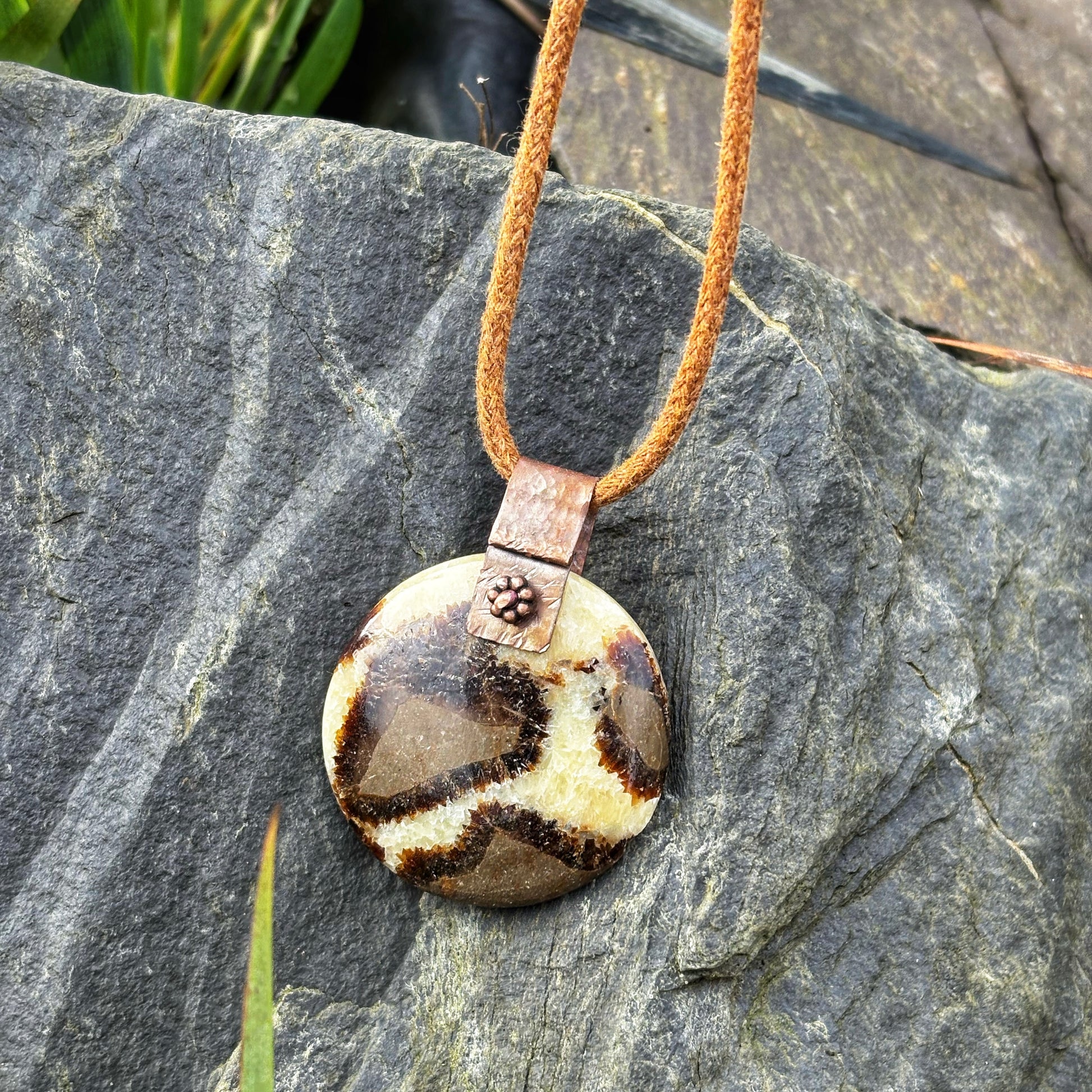 This one of a kind necklace features natural Septarian, a stone formed millions of years ago from limestone, calcite, and aragonite, also known as Dragon Stone. Its striking earthy tones and bold, organic pattern make every piece truly unique. Set with a rustic, handmade textured copper bail and finished on a soft tan cord, this necklace is perfect for everyday wear or layering with other favourites.