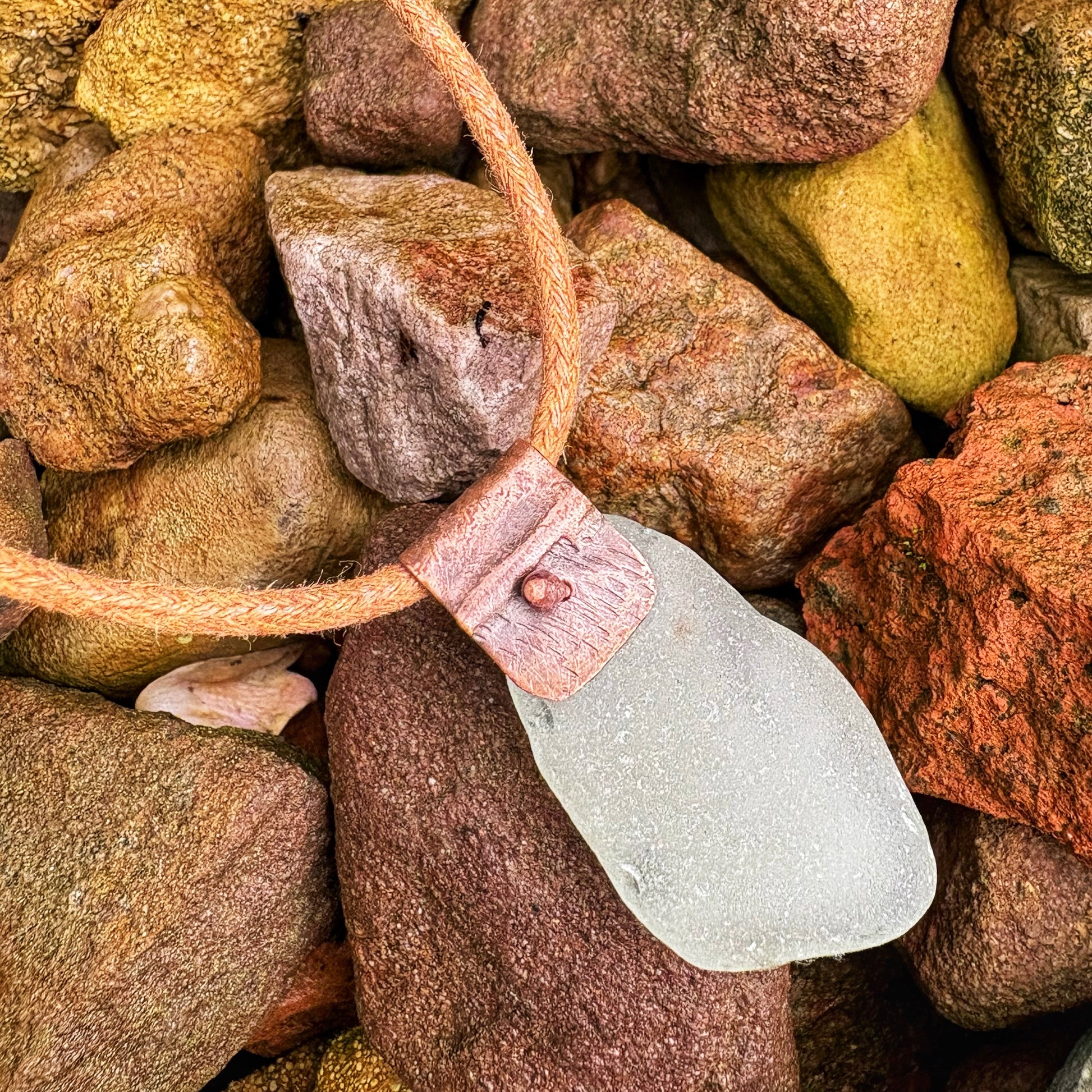 This one of a kind necklace features a beautiful, natural piece of seafoam green sea glass. I have drilled it before creating a copper bail, which I have textured and antiqued to give it a boho, rustic look.