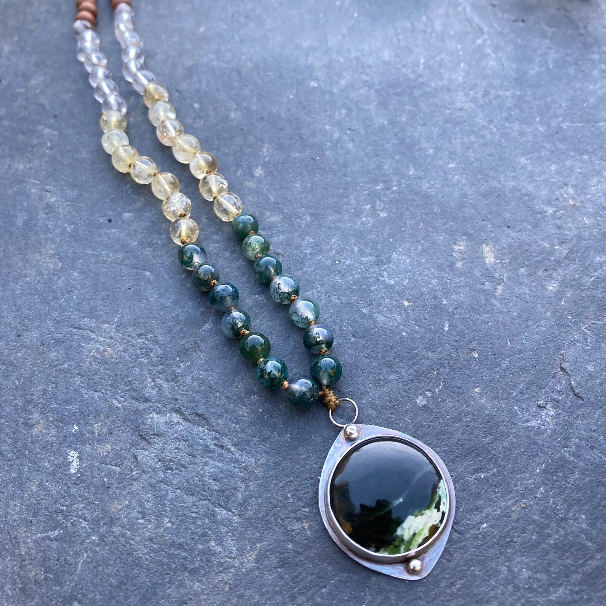 I have bezel set a beautiful Chrome Chalcedony cabachon in recycled sterling silver to make this unique pendant. I have then hand knotted it with Grade AAA Moss Agate, Citrine, clear Quartz and fragrant Sandalwood onto nylon cord. I have finished this necklace with a handmade sterling silver S-clasp for closure.