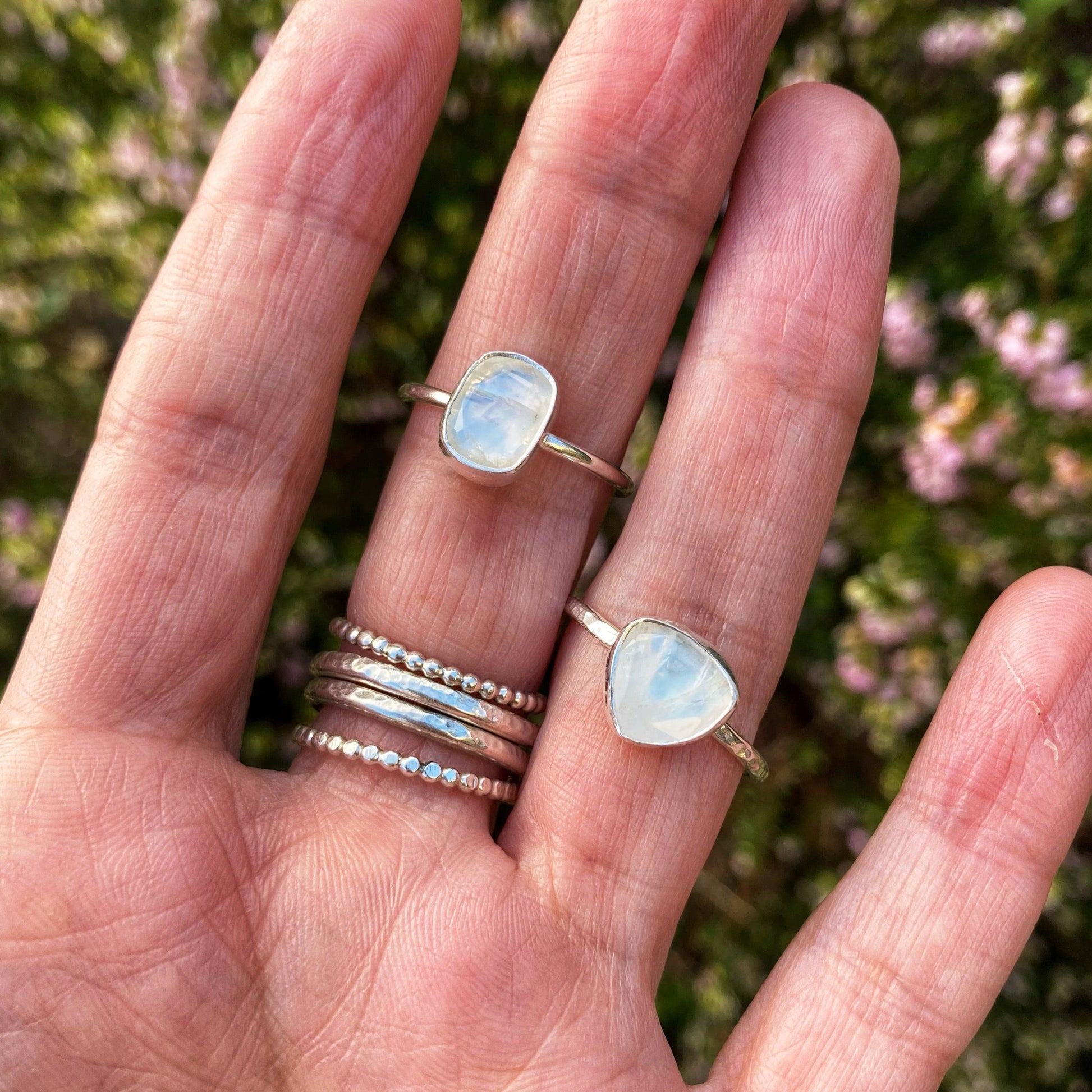 I have set beautiful, rainbow Moonstone in recycled sterling silver to create these faceted rainbow Moonstone rings. They sit upon 2mm bands. There is currently one of these gorgeous rings available.