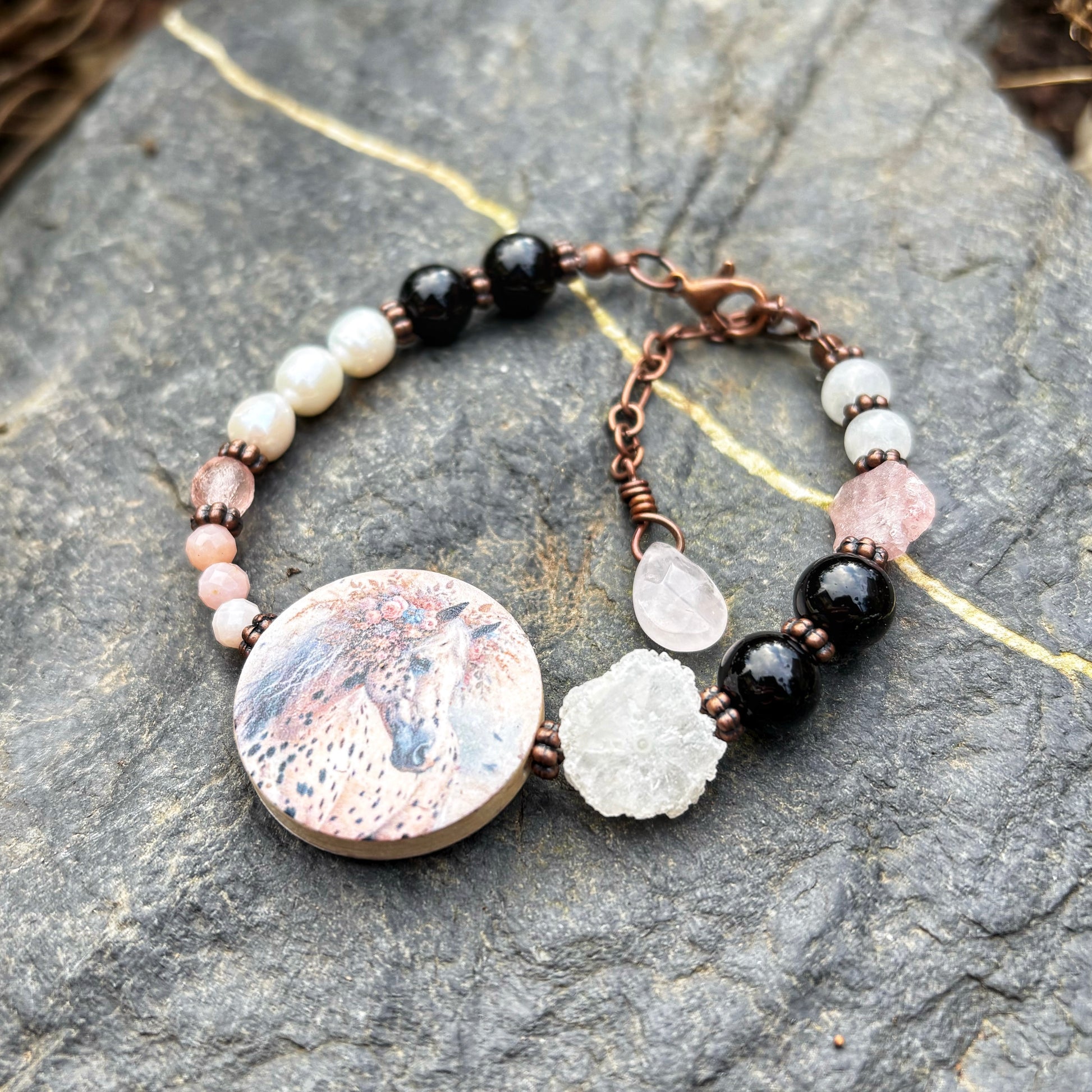 This one of a kind bracelet features a beautiful, artisan horse focal. I've surrounded it with Czech glass, Black Tourmaline, Pink Opal, Pearl, Snowflake Obsidian, Rose Quartz, Strawberry Quartz, Solar Quartz, clear Quartz and copper.
